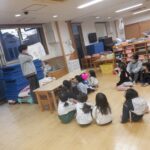 以前植えたチューリップの球根の成長を楽しみに思う4人。初めて水をあげた日と2回目の大きさの違いに驚いたようで、折り紙で作って比べていました。保育者から茶色の画用紙をもらうと、芽をはったり、折り紙の土をかぶせて成長を記録していました。
