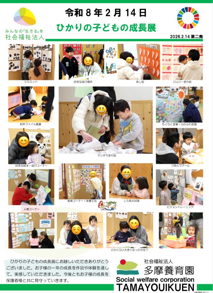 ひかりの子どもの成長展にお越しいただきありがとうございました。お子様の一年の成長を作品や体験を通して、実感していただきました。今後ともお子様の成長を保護者様と共に見守っていきます。
