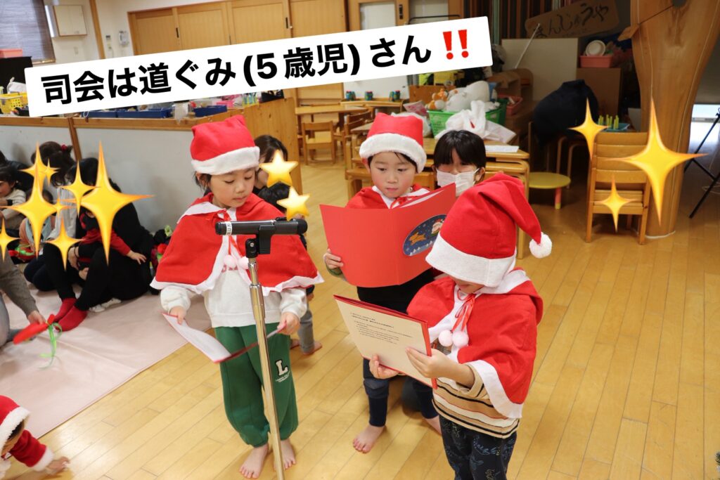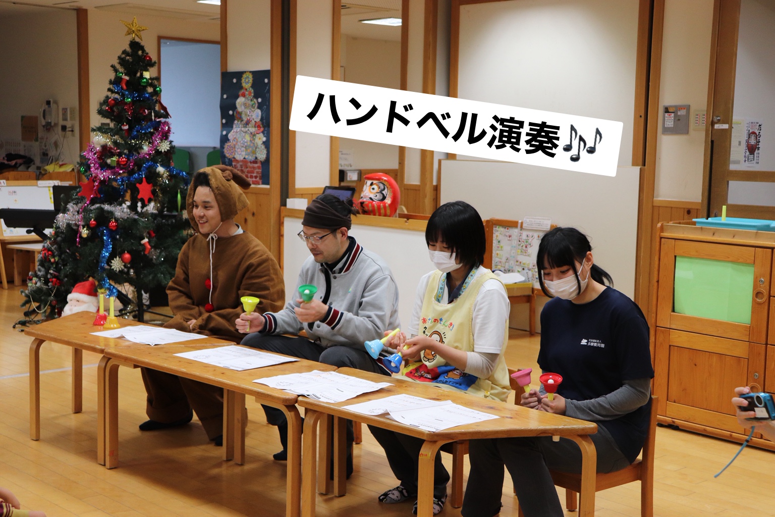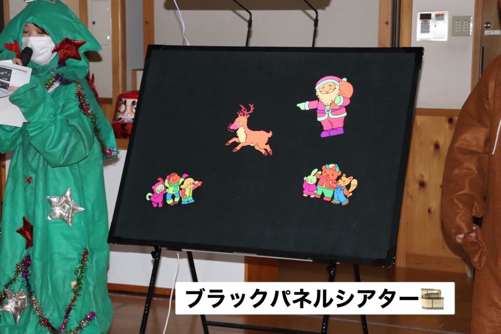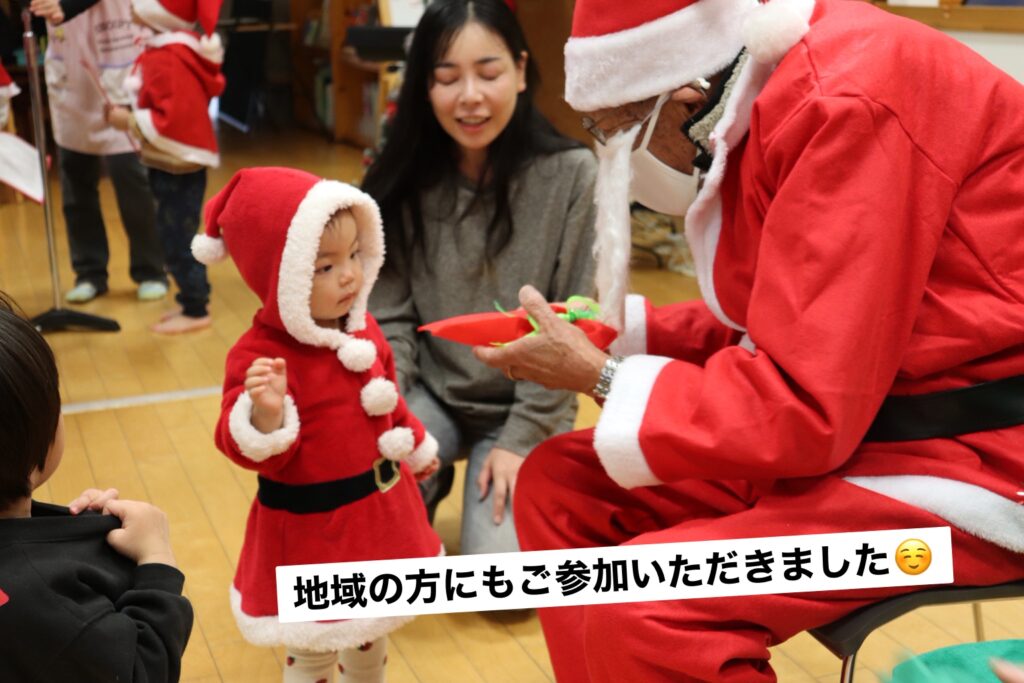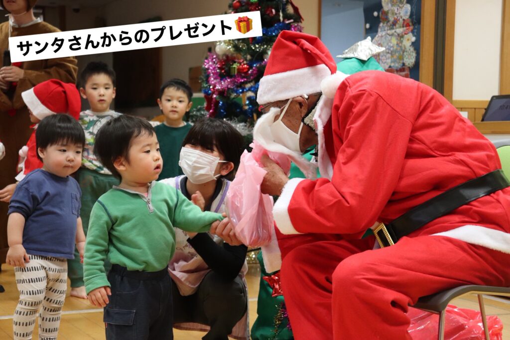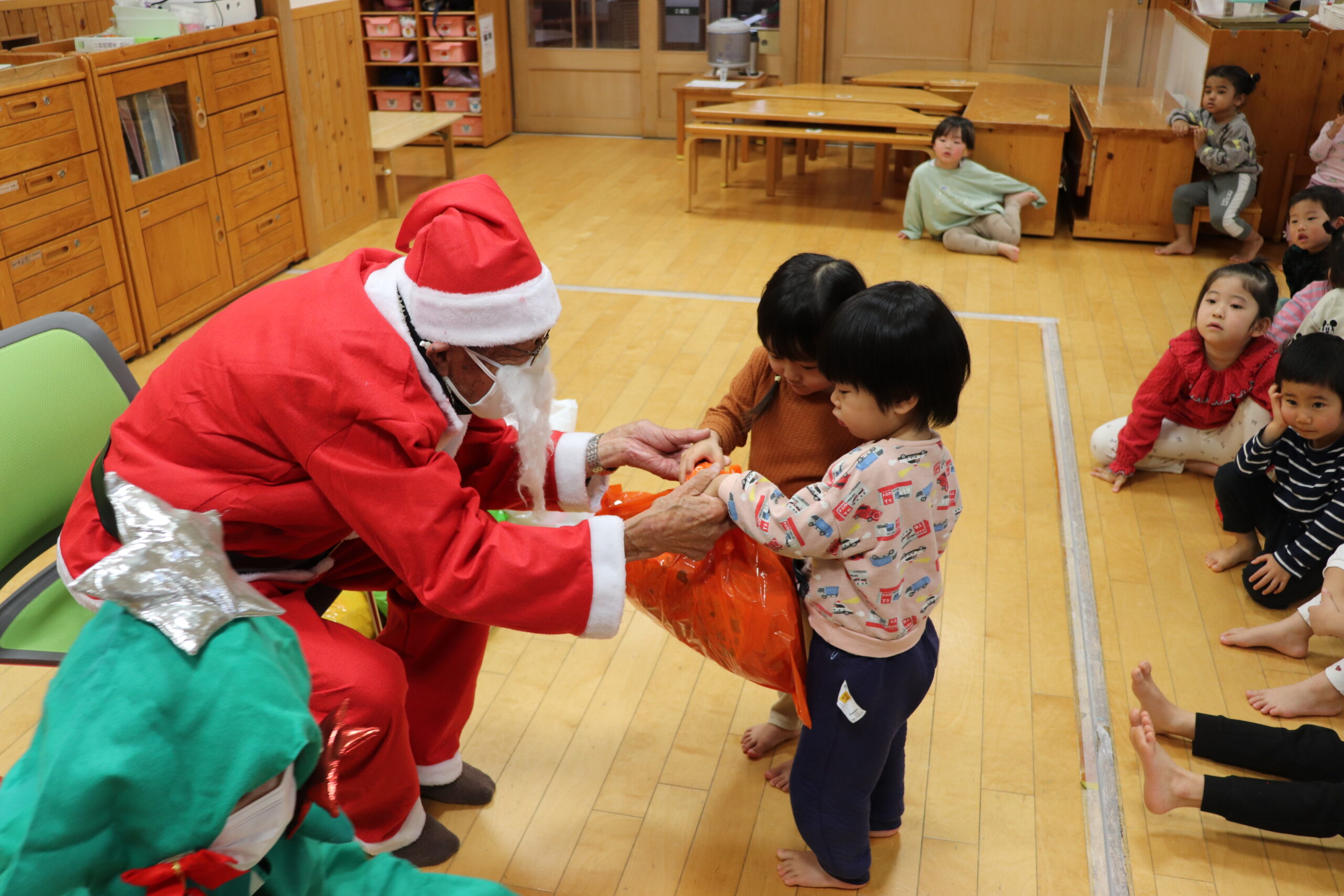 イエスキリストが生まれた日をお祝いするクリスマス。地域の方々にもご参加いただき、楽しい会となりました。ブラックパネルシアターや職員のハンドベル演奏を真剣に見たり聞いたりし、心躍らせる子どもたち。鈴の音が聞こえると、サンタさんが登場。クラスごとに子どもたちからサンタさんへ質問をしました。「好きな服の色はなんですか?」「好きな食べ物はなんですか?」など、たくさんの質問に答えてもらい、嬉しそうに笑っていました。最後はサンタさんからプレゼントをもらい、「何が入っているのかな」とお友達とお話ししながら、期待に胸を膨らませていました。