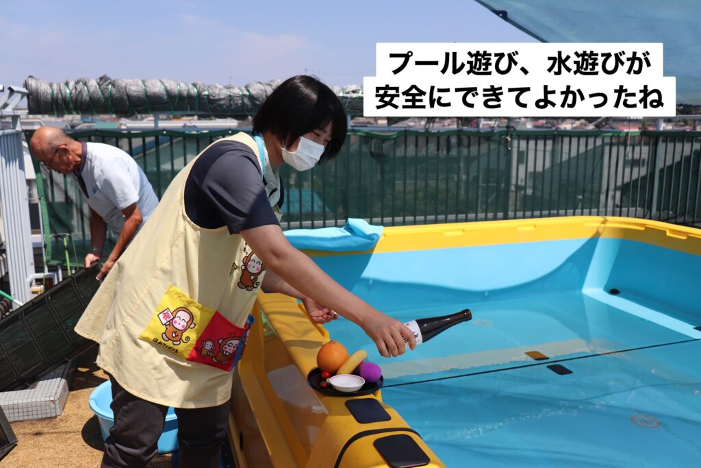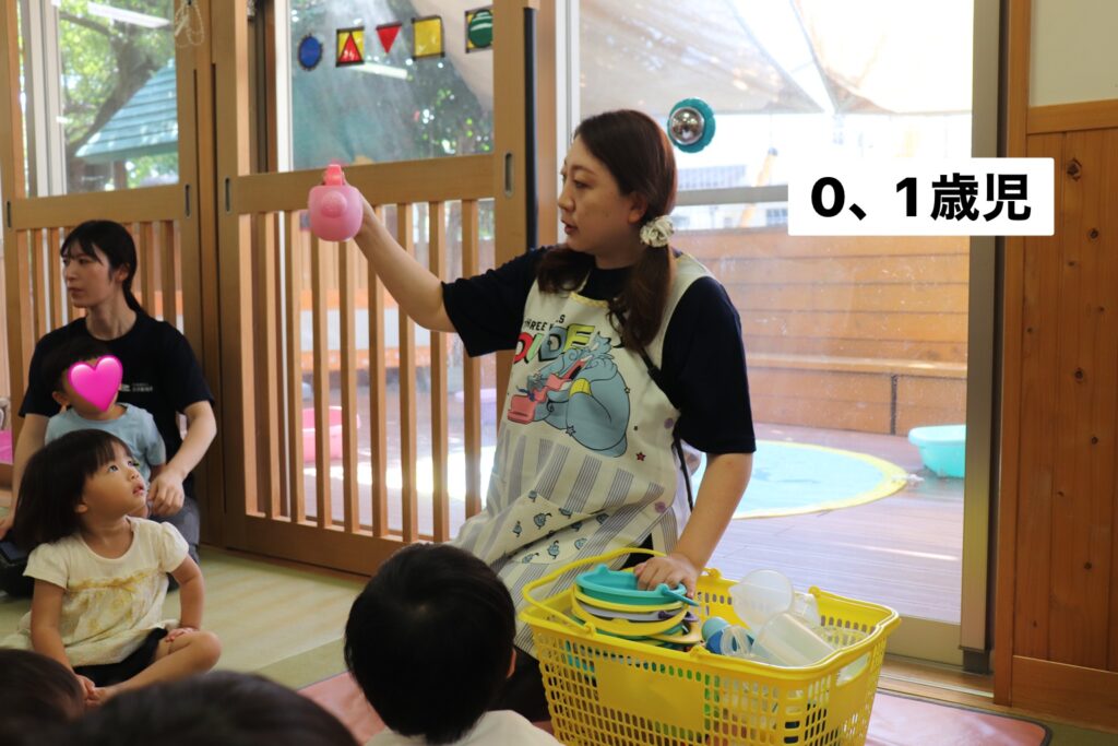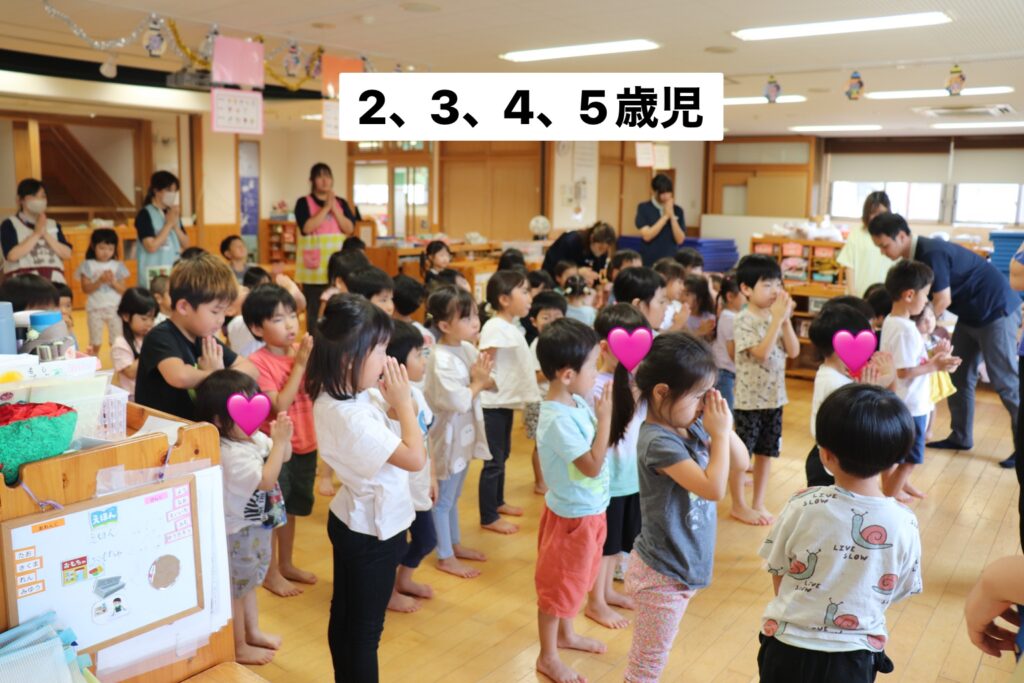今日は0、1歳児は1階テラス前で、2、3、4、5歳児は2階ホールでプール納めを行いました。集いではプールや水遊びで楽しかったことを発表し、思い出を振り返り、無事にプール活動を終えることができたという感謝の気持ちを込め、手を合わせ一礼しました。来年度も楽しいプール、水遊びができますように。