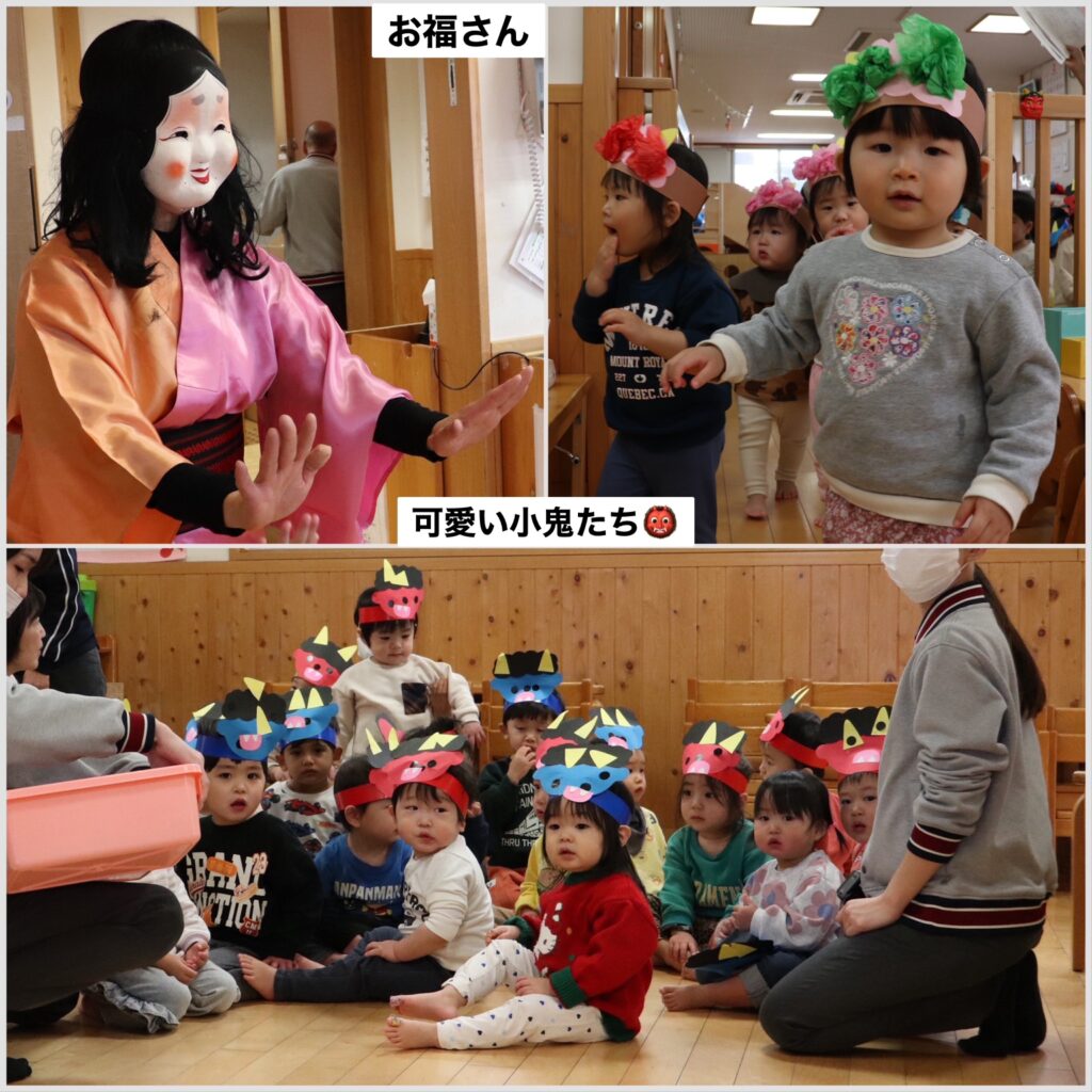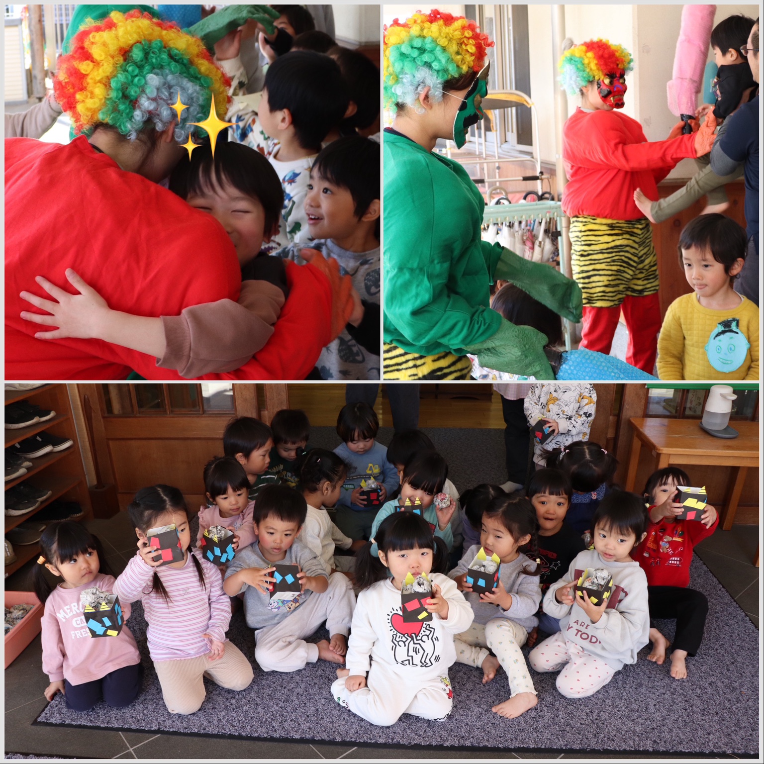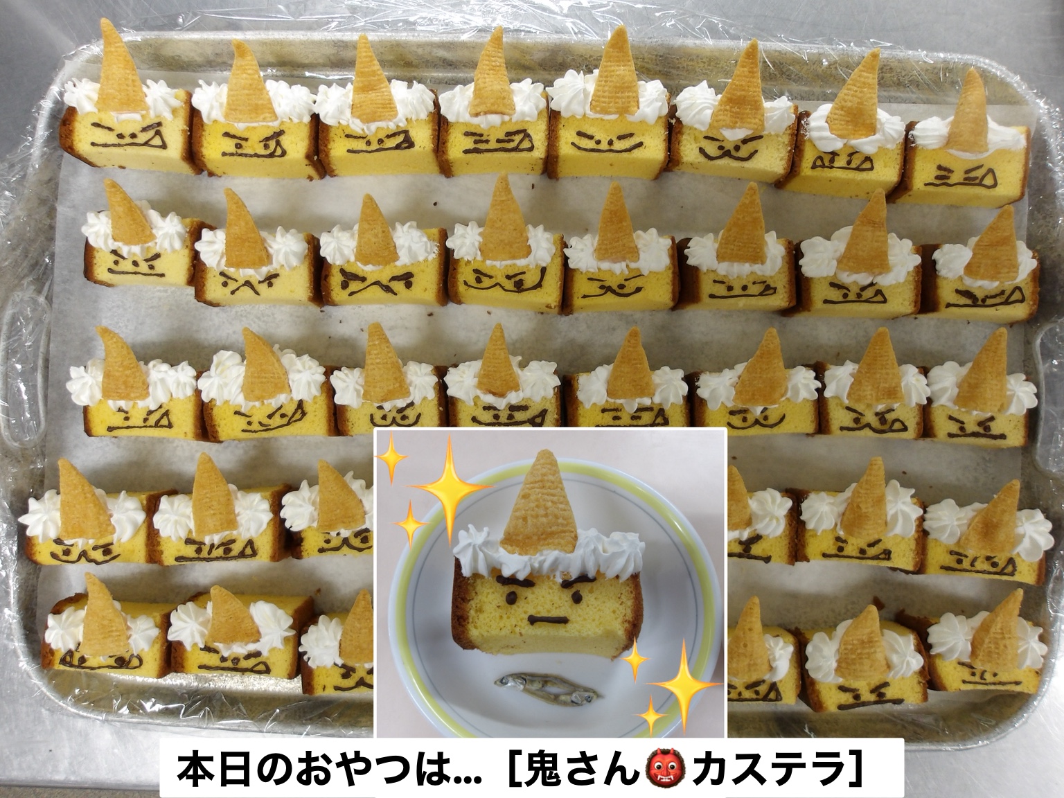 本日は節分の集いでした。鬼の登場にびっくりしてしまう子もいましたが、新聞紙で作った豆を投げ、鬼を退治するために奮闘しました。最後に鬼と仲直りし、ひいらぎの葉といわしで今年一年の健康を祈りました。おやつには「鬼さんカステラ」が出ました。「かわいい‼︎」「おいしそう‼︎」と子どもたちは大喜びでした。