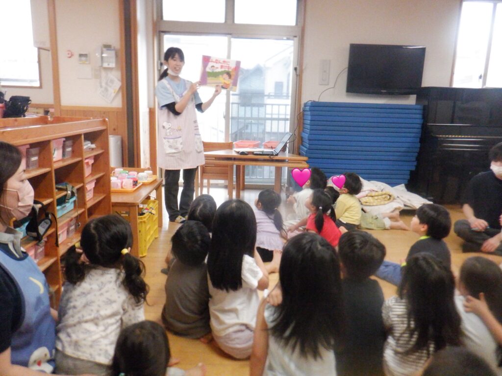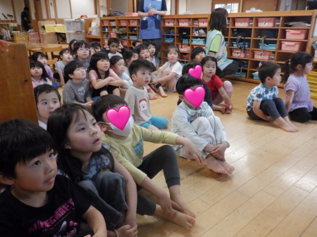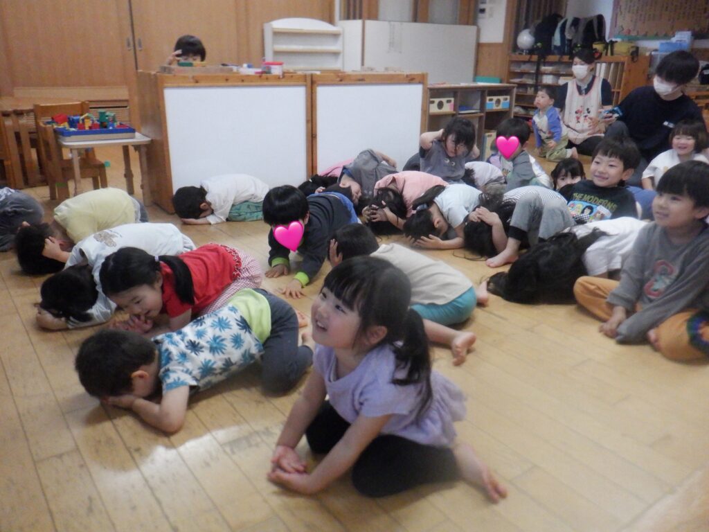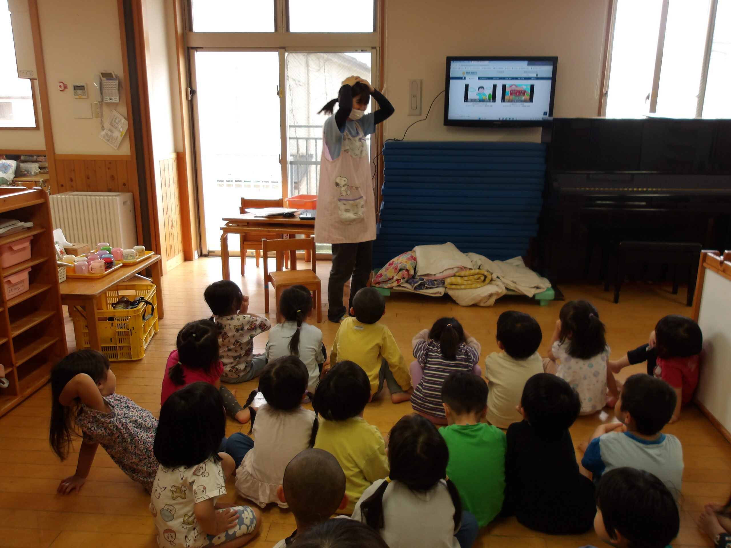 本日は図上の避難訓練を行いました。地震や火事が起こった際にどのように避難をすれば良いのかをビデオを通して学ぶことができました。「おかしも」の約束について確認する中で、「“な”がないよ」と、これまでの避難訓練を思い出し、「おかしもな」という約束もあることに気が付く姿も見られました。紙芝居では避難場所の確認、最後はダンゴムシポーズをみんなで行い避難訓練の理解を深めました。