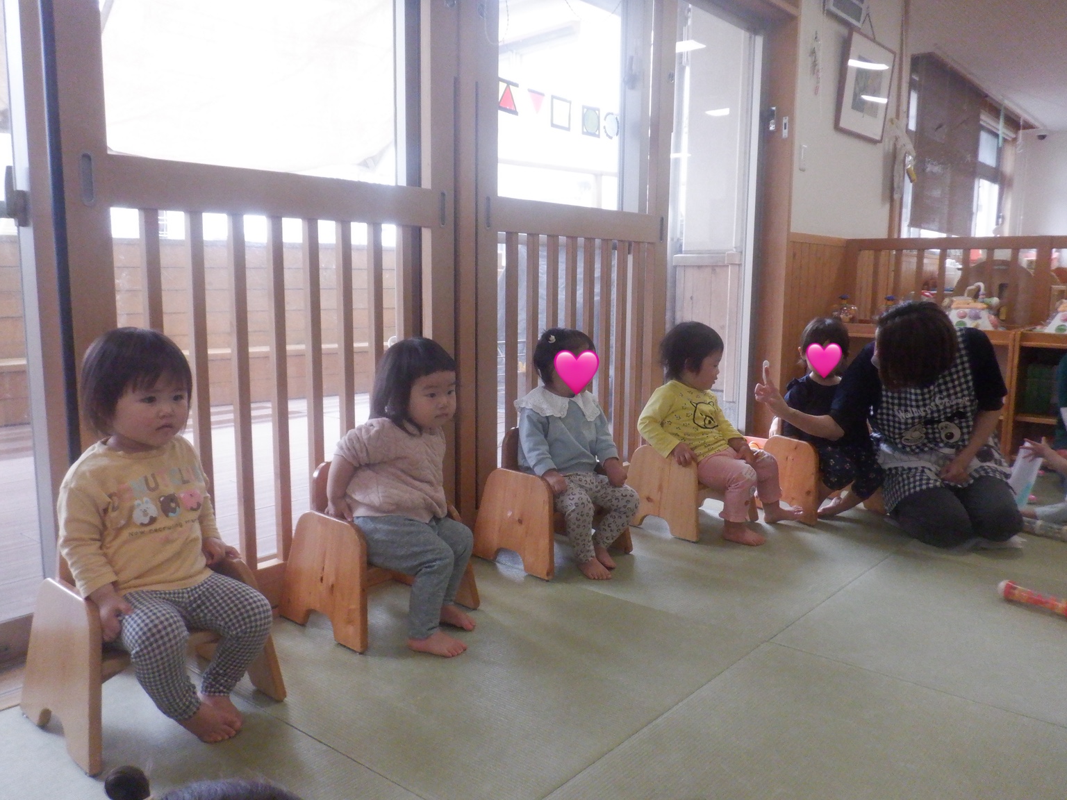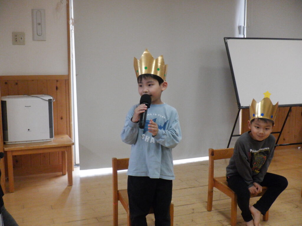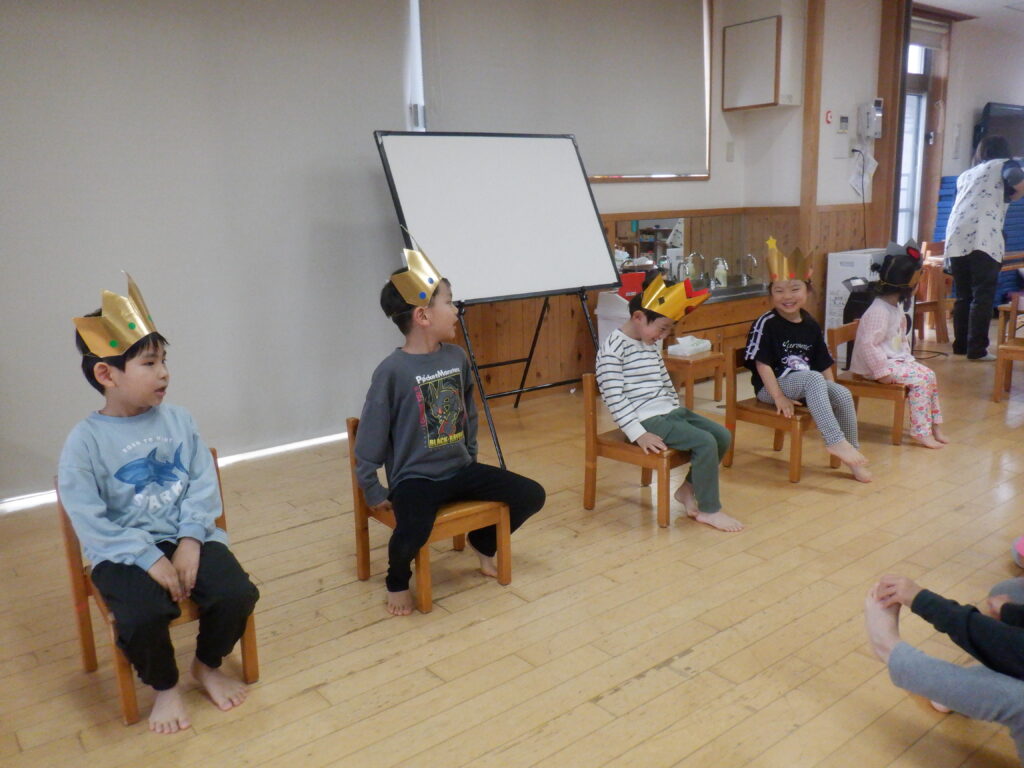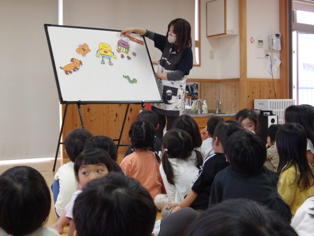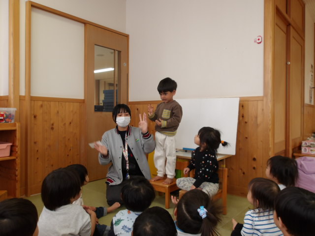 本日は誕生会を行い、各クラスでお誕生日のお友だちをお祝いしました。お誕生児の紹介では少し照れながらも嬉しそうな笑顔が見られ、とても温かい雰囲気に包まれました。その後は、パネルシアターや手袋シアターを楽しみ、子どもたちは興味津々で見ていました。楽しい時間をみんなで共有することができ、素敵な一日となりました。