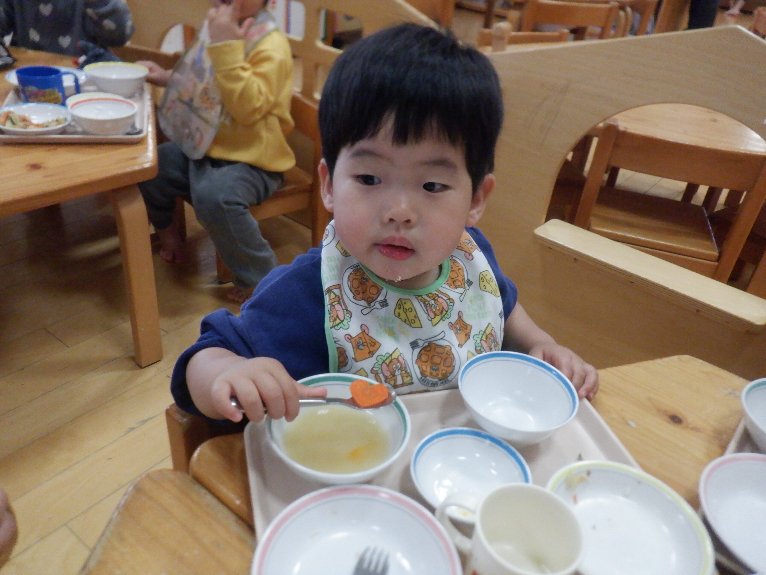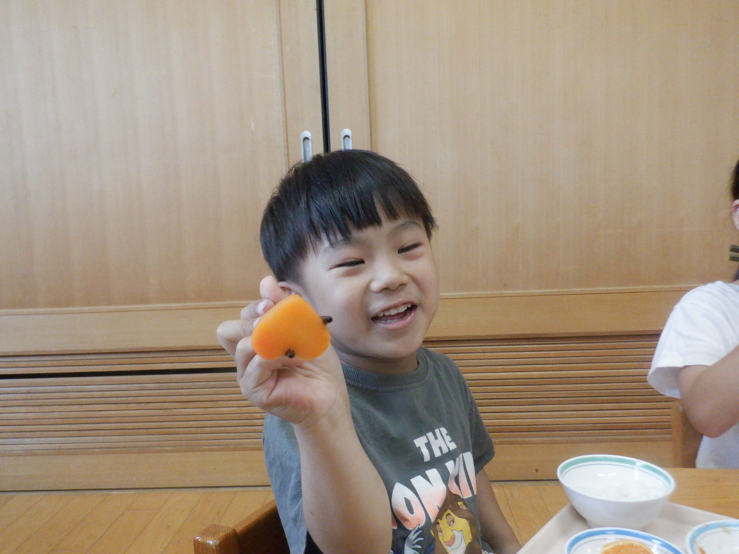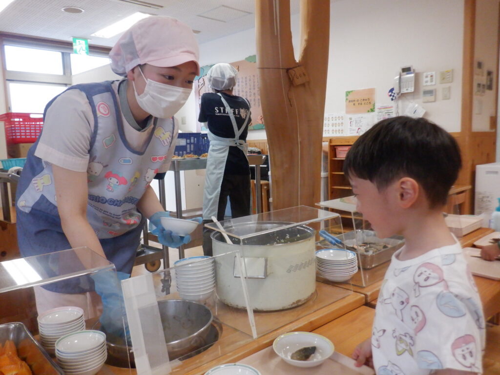 野菜が苦手な子も「にんじんいっこだけ…」と野菜を少し食べてみたり、「つぎははいってるかな」と期待感を持っておかわりをする子もいたりと、野菜をすすんで食べてみようとする姿が多くみられました。次の「らっきーきゅうしょくのひ」もお楽しみに!