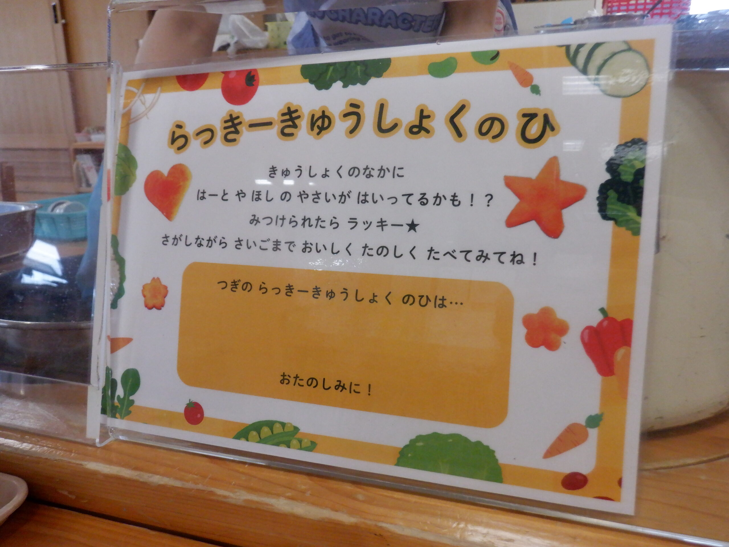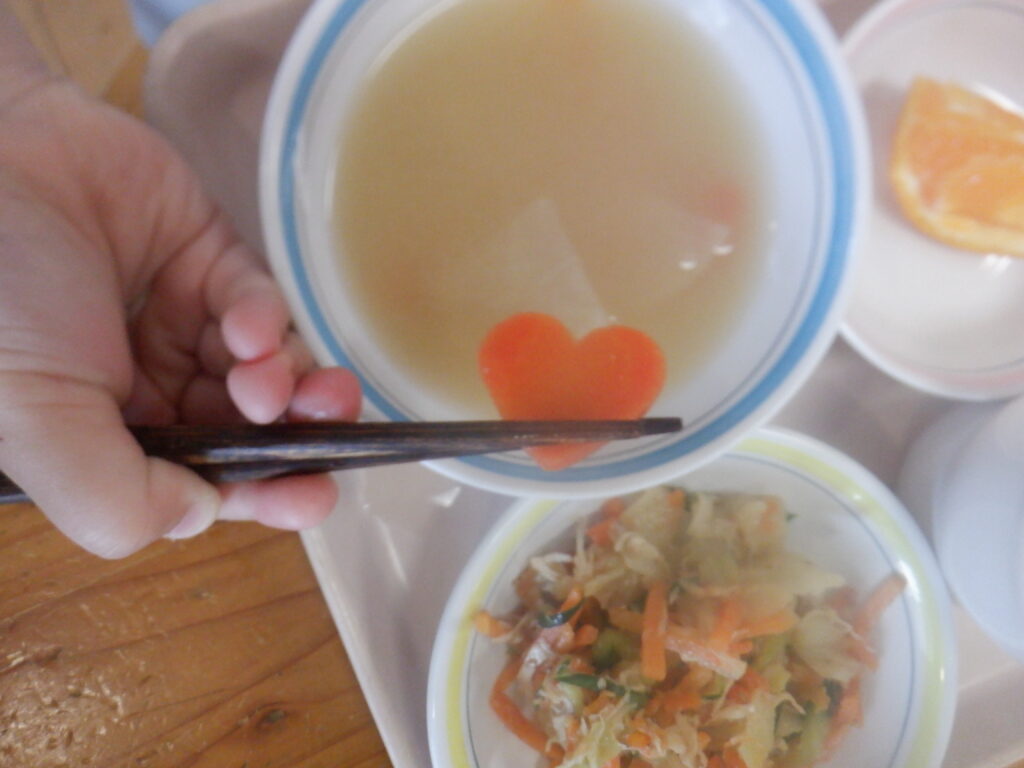 本日は「らっきーきゅうしょくのひ」ラッキーな子には、給食のみそ汁に星やハート型の野菜が入っていました。