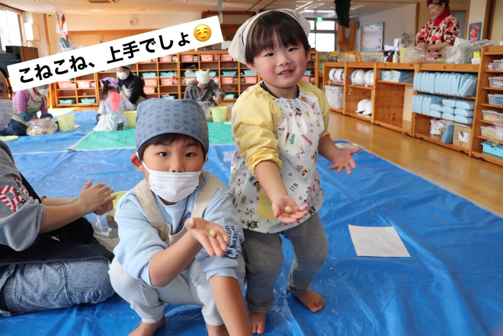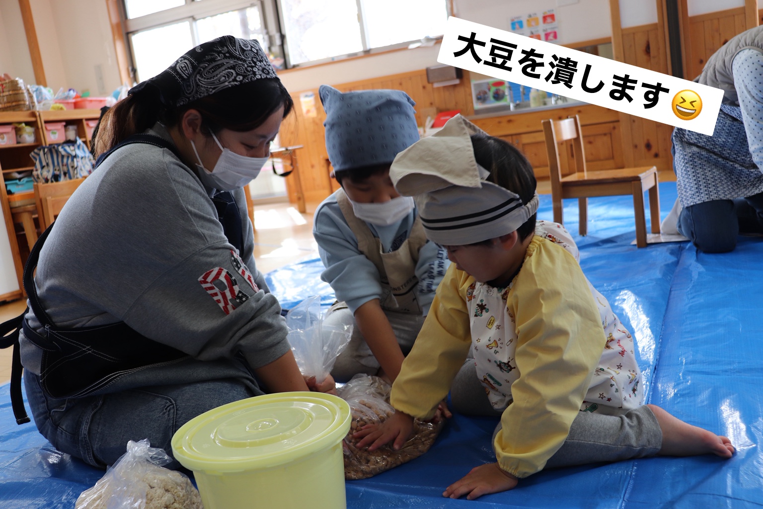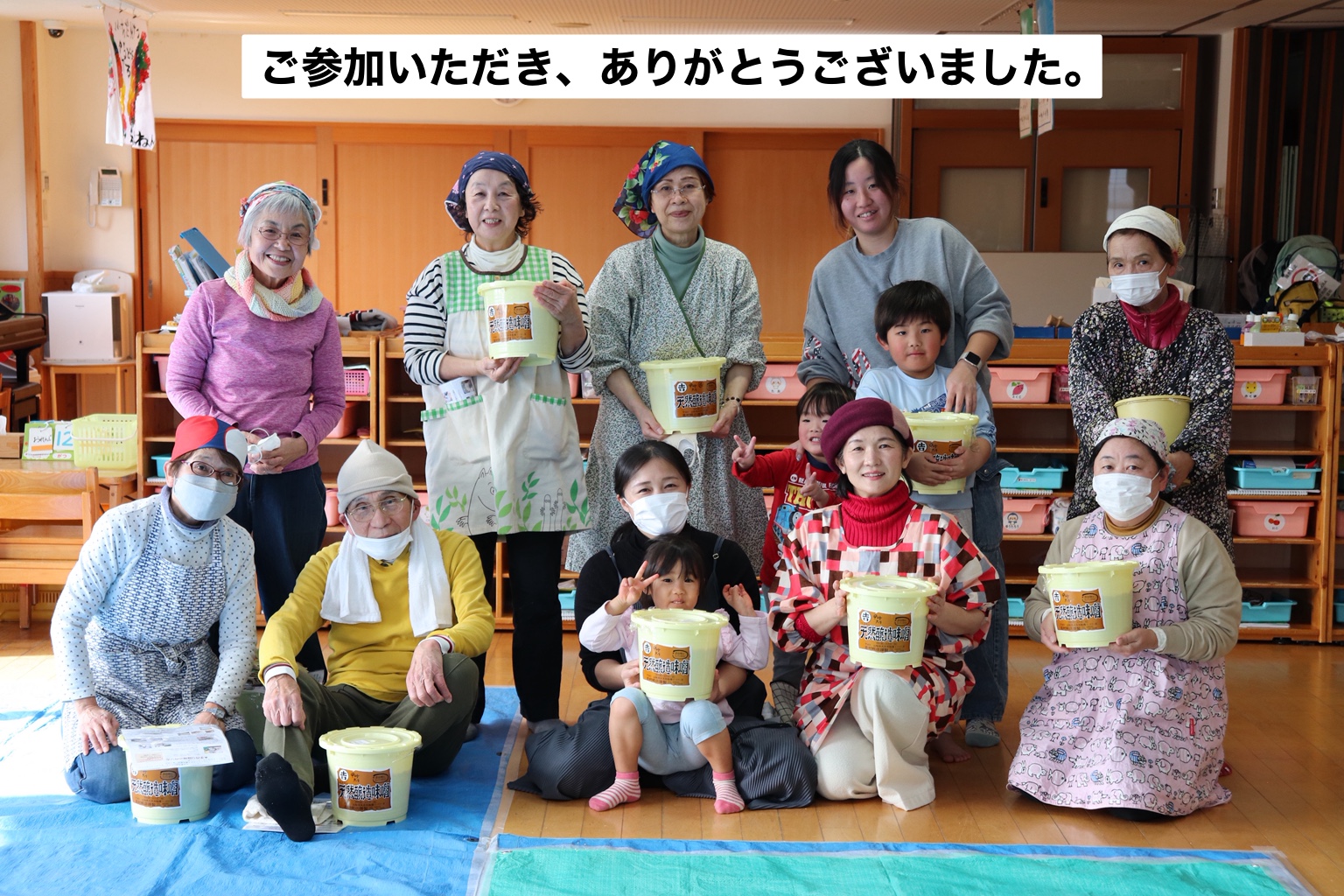「いい匂い‼︎」「潰すの楽しい‼︎亅と会話を楽しみながら、手や足を使って大豆を潰し、麹と塩を入れて優しく混ぜ合わせました。あとは各ご家庭で寝かせて完成です。おいしい味噌ができるのを楽しみに待っていてくださいね。