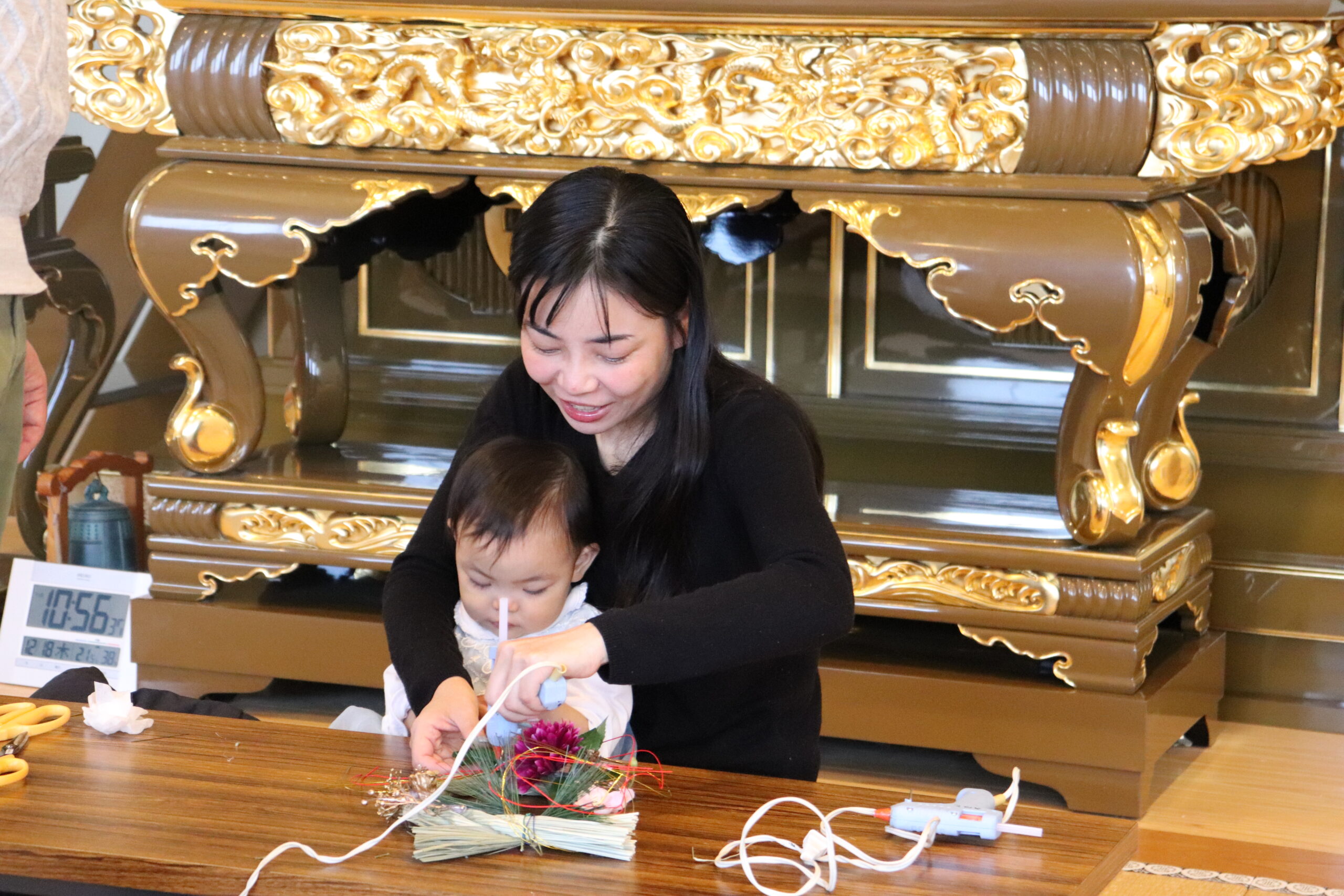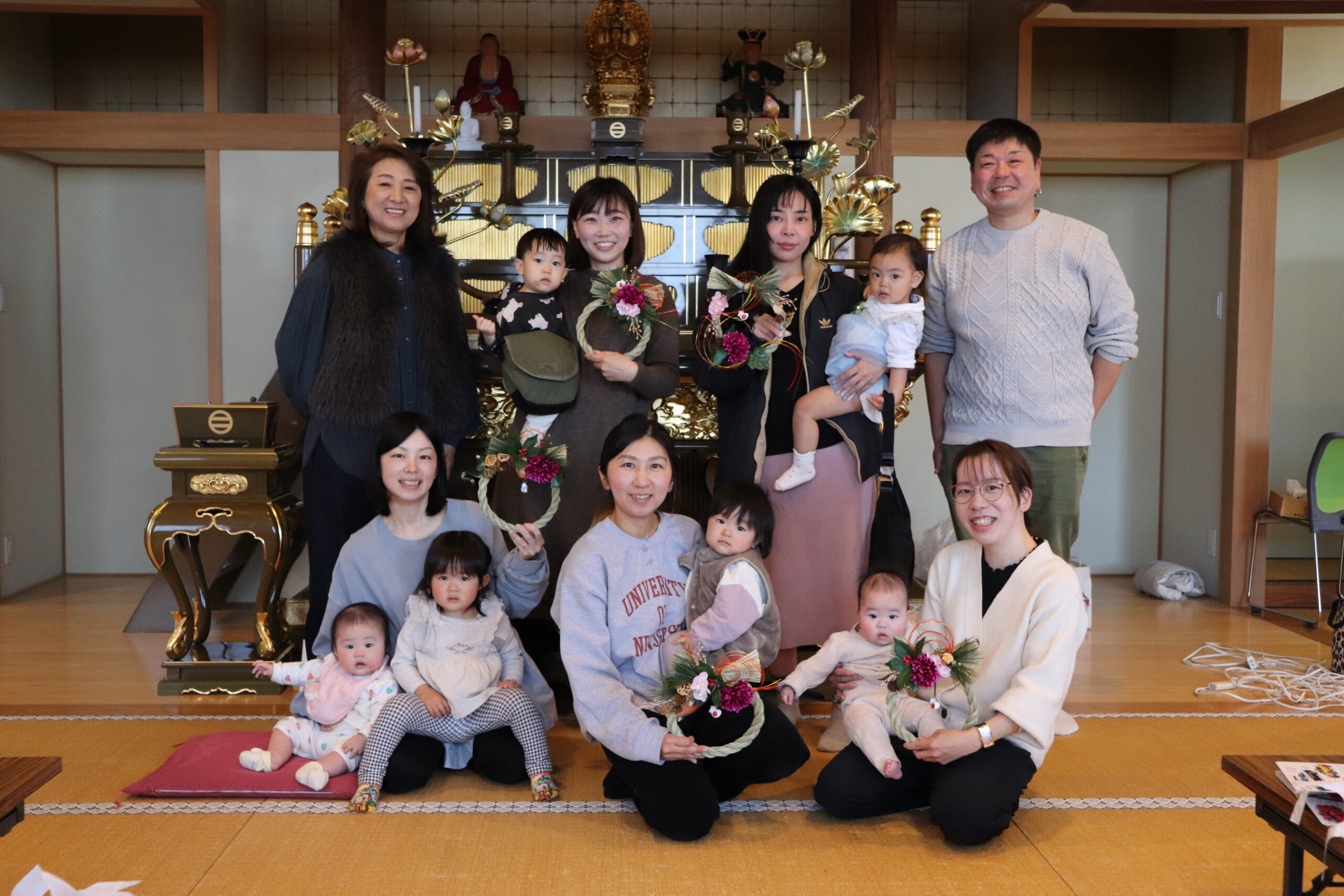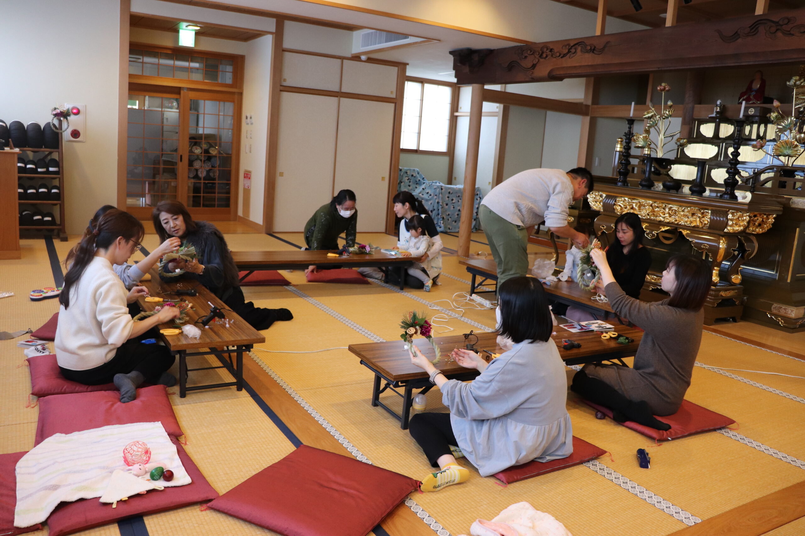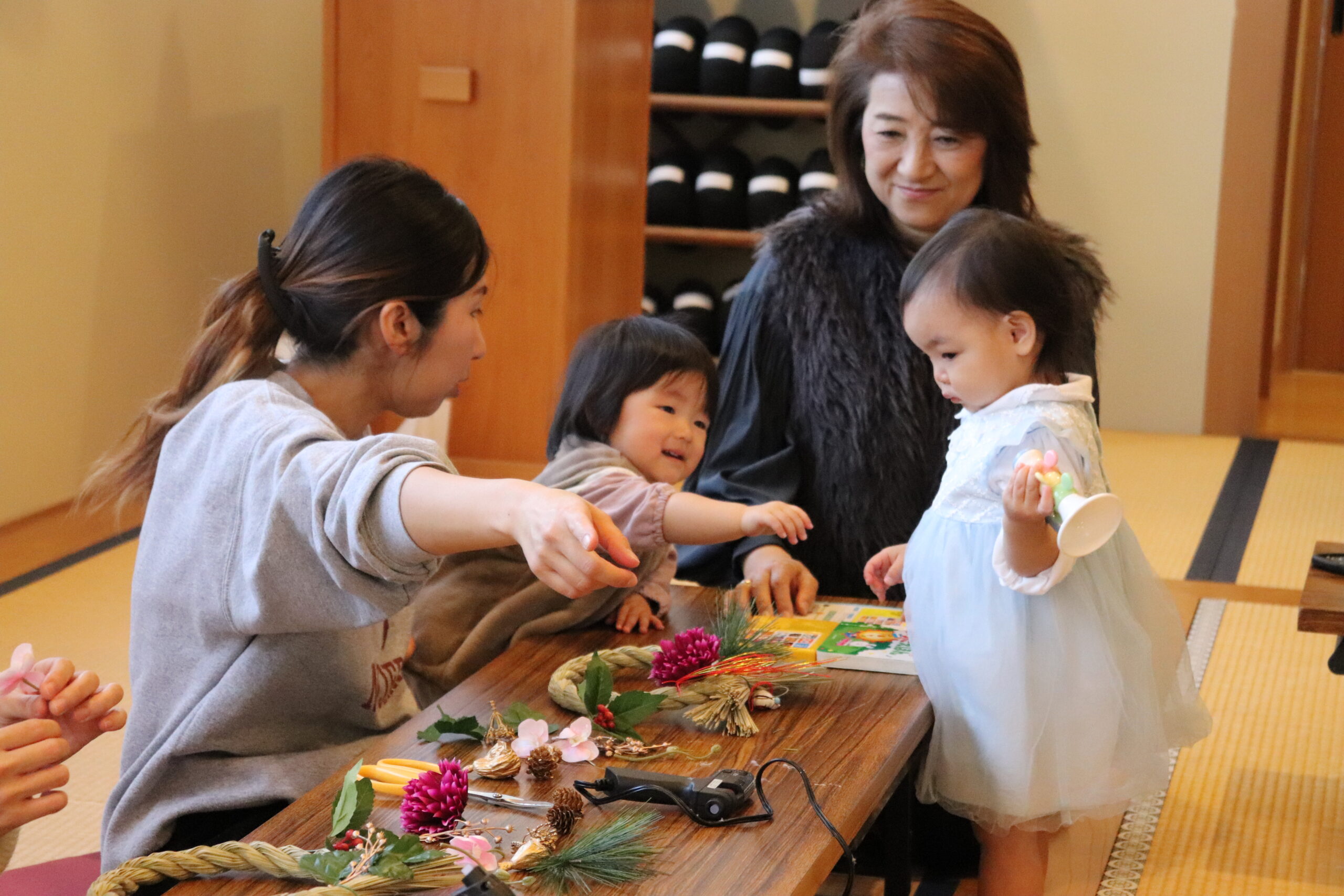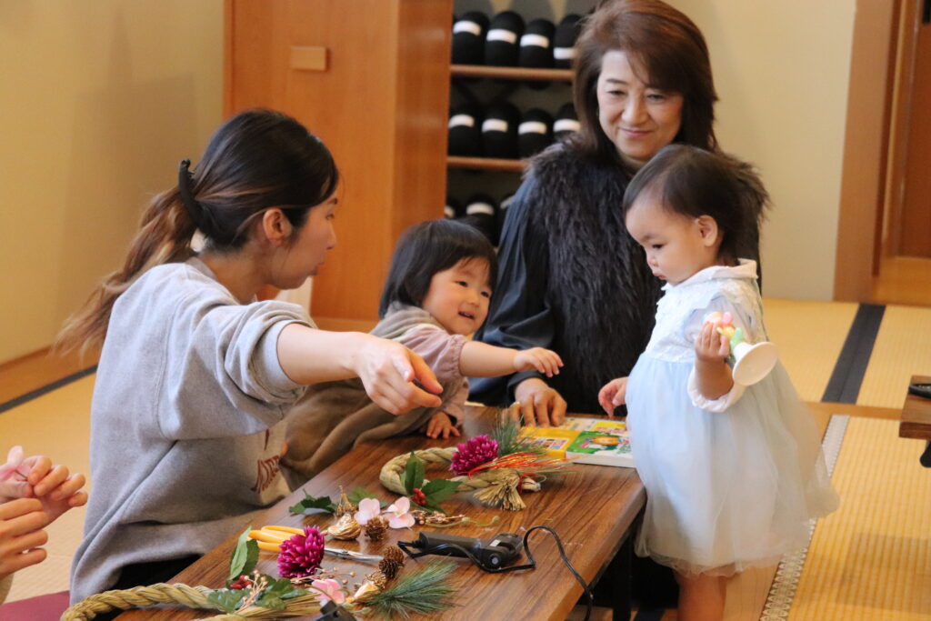 12月18日、子育て広場「花育」に講師として府中市や国立市を中心に夢と笑顔とワクワクを育むワークショップ活動を行っている「i-ze(いーぜ)」さんを迎え、「正月飾り」作りを行いました。お子さんに見守られながら制作を楽しむ皆様、正月飾りの意味や豆知識を聞きながら和気あいあいとした空間を楽しみました。一人一人の個性あふれる素敵な作品が出来上がりました。